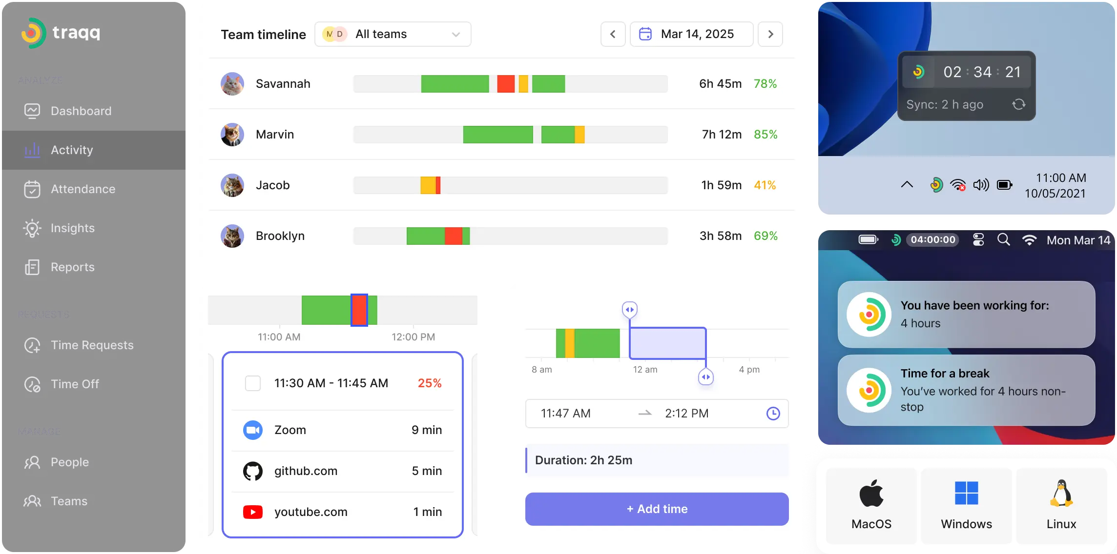 Track time seamlessly whether you’re online or offline with our lightweight tracker. Traqq runs smoothly on Windows, Mac and Linux without hogging your computer’s resources.