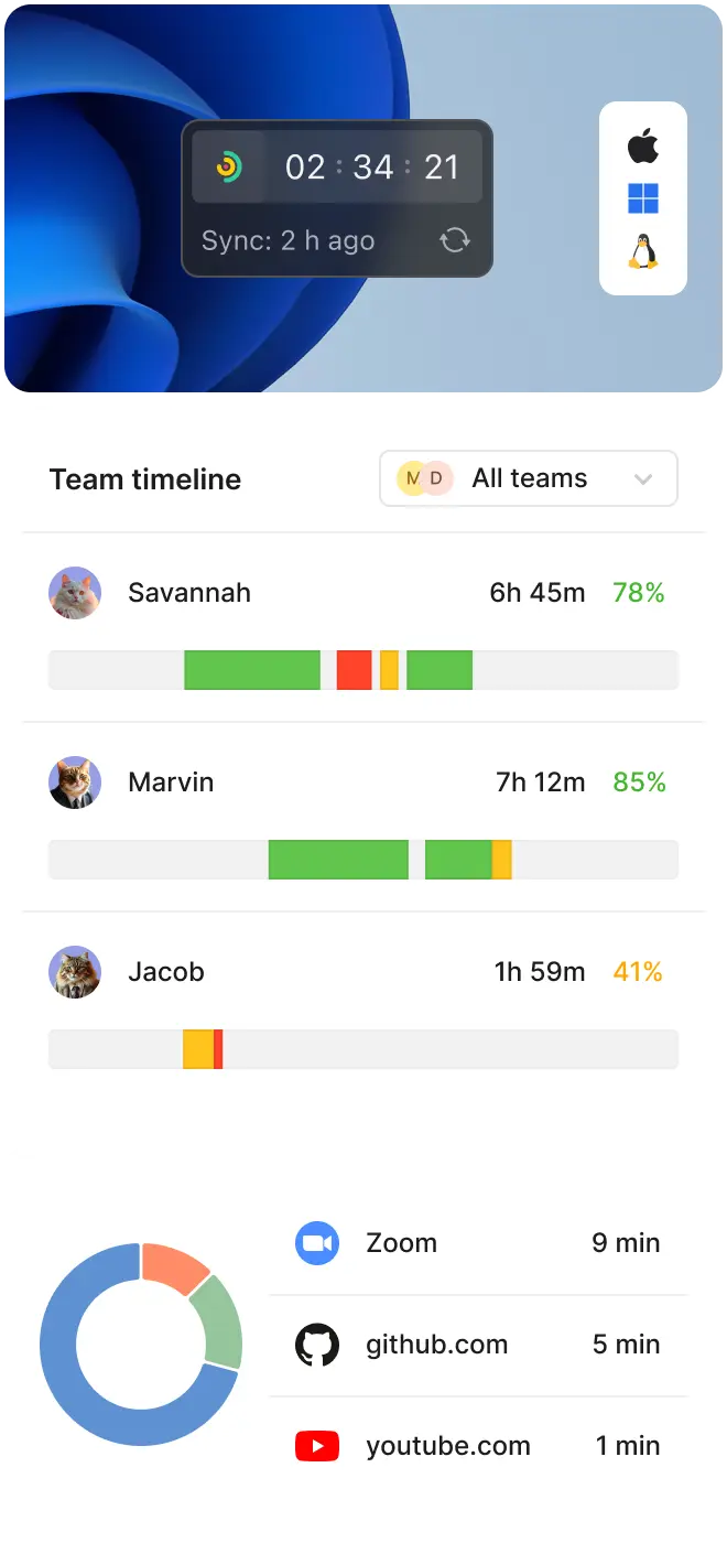 Track online status and active hours across time zones with one complete solution. Traqq’s desktop app shows when team members are available, making it simple to coordinate across global teams.
